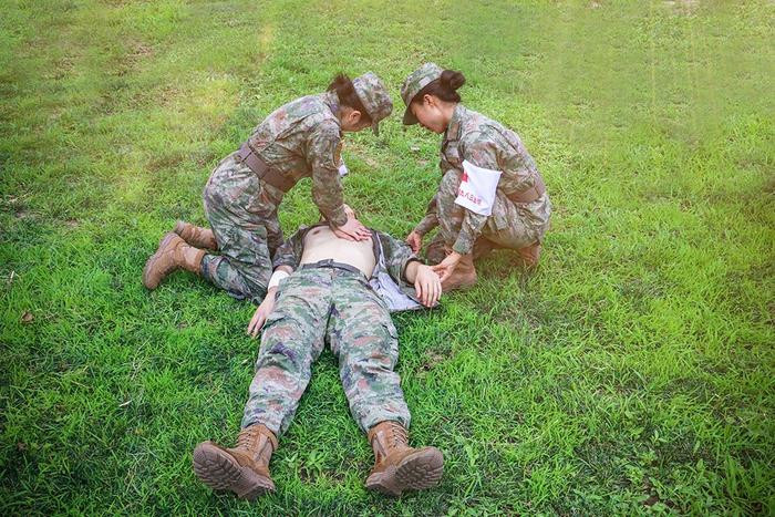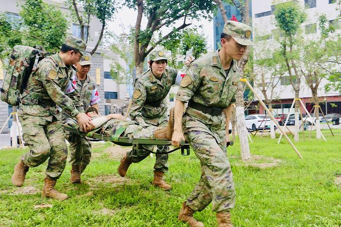 “前方发现伤员,立即支援救治!”随着指令下达,救护人员顶着烈日,在高温环境下快速穿越草地通过封锁线。模拟战场上,救护人员迅速判定环境安全,随即展开救治解除装备、判断伤情、安抚“伤员”,一气呵成完成止血、包扎、固定等流程。